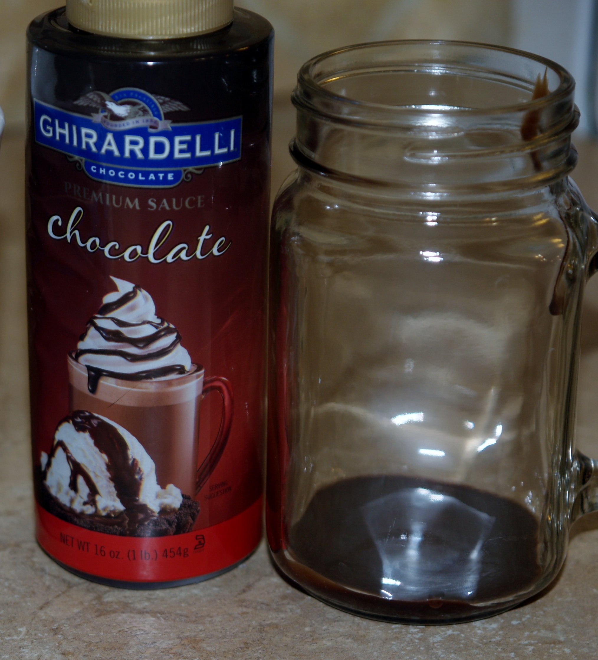 1. Select a large mug and put 1-2 tablespoons of chocolate syrup or cocoa powder in the bottom of the mug. Today, I am using one by Ghirardelli, but I love using high-quality cocoa for its health benefits and intense chocolate flavor, so I do that a lot, too.